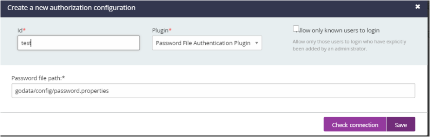ADD 버튼을 누르고 ID설정 Pligin 을 Password File로 설정 path는 /godata/config/password.properties 로 설정