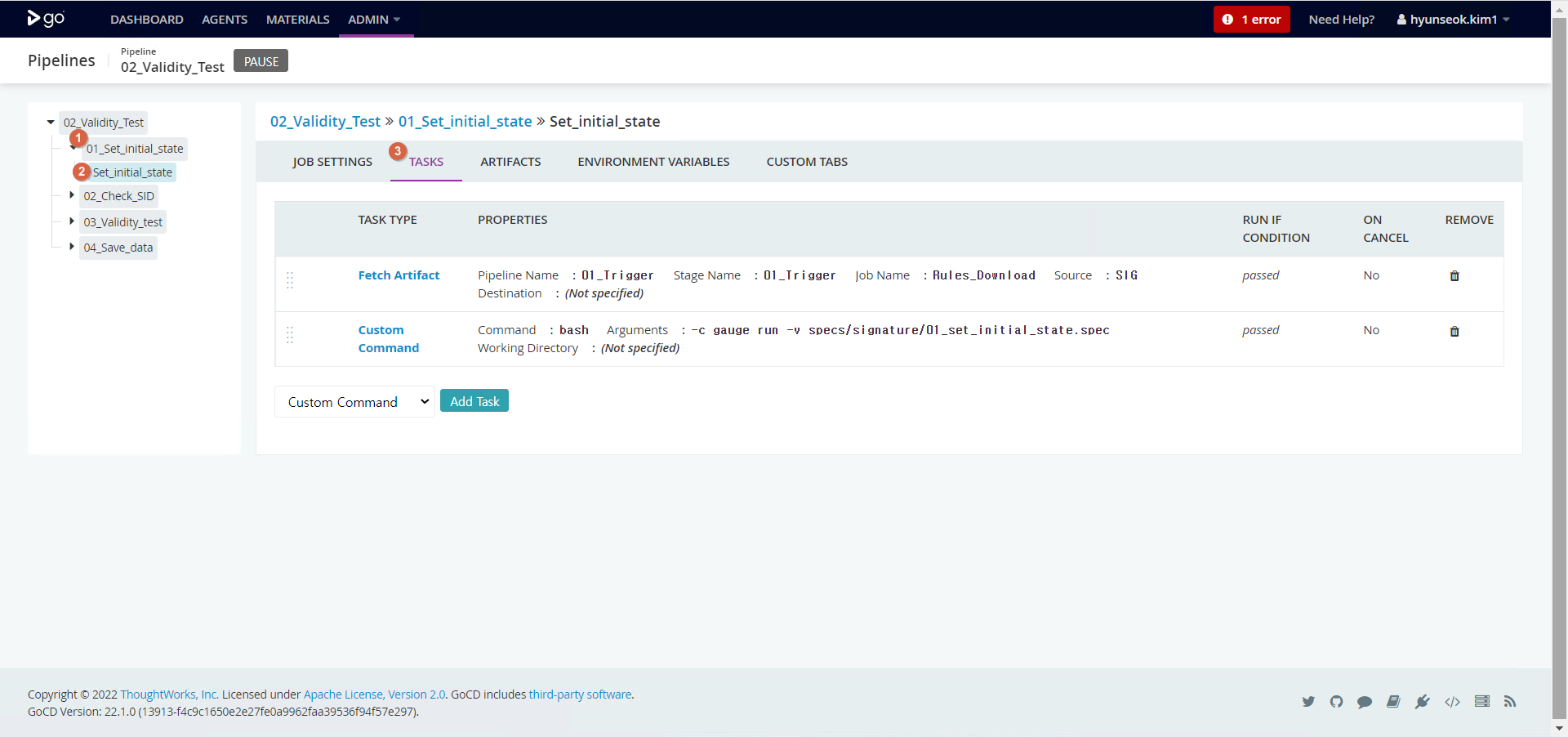 위 첨부 사진을 예로 보면, ① '01_Set_initial_state' 이름의 Stage 안에 ② 'Set_initial_state' 이름의 Job이 있으며, 해당 Job에는 ③ gauge run -v * Task (Command)가 존재합니다.