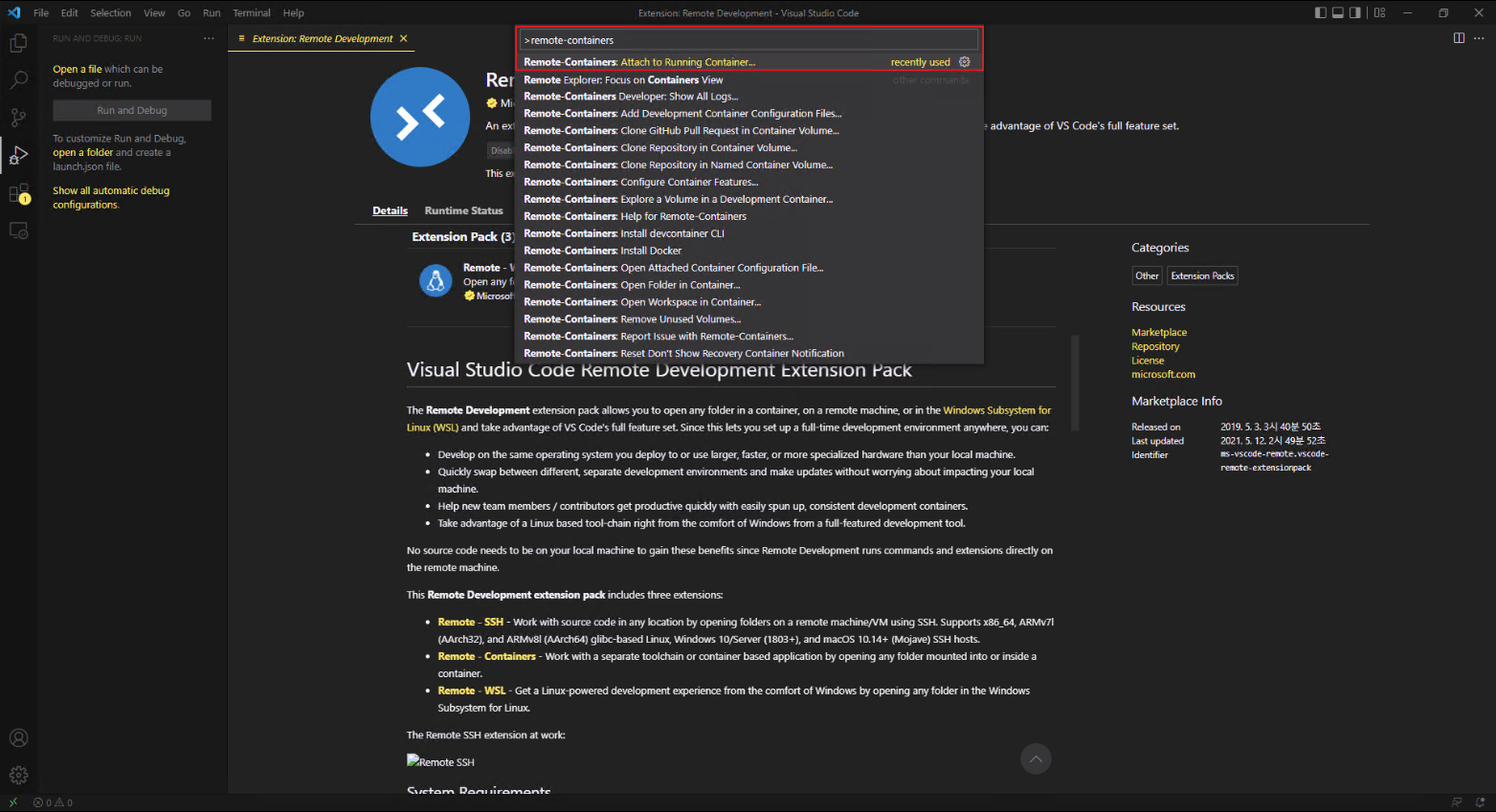 • remote development를 검색 및 설치합니다.