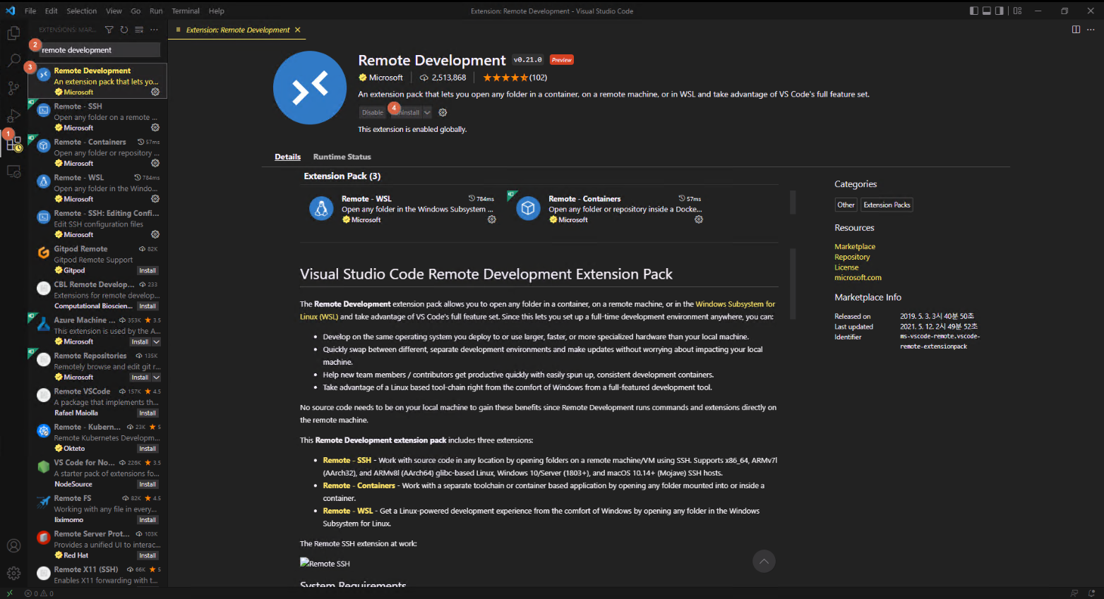 - remote development를 검색 및 설치합니다.