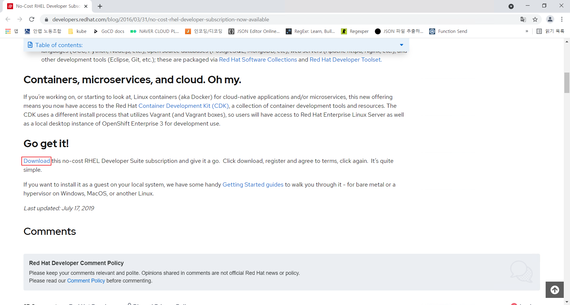 2-1) 계정 생성을 완료하였으면 로그인 후 https://developers.redhat.com/blog/2016/03/31/no-cost-rhel-developer-subscription-now-available 페이지로 이동한다.