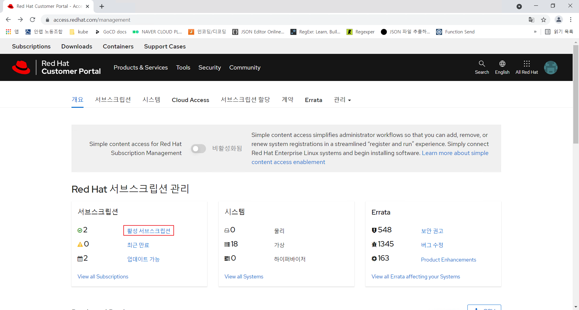 3-1) 위 Step을 완료하였으면 https://access.redhat.com/management 페이지로 이동하여 '활성 서브스크립션'이 추가된 것을 확인할 수 있다.