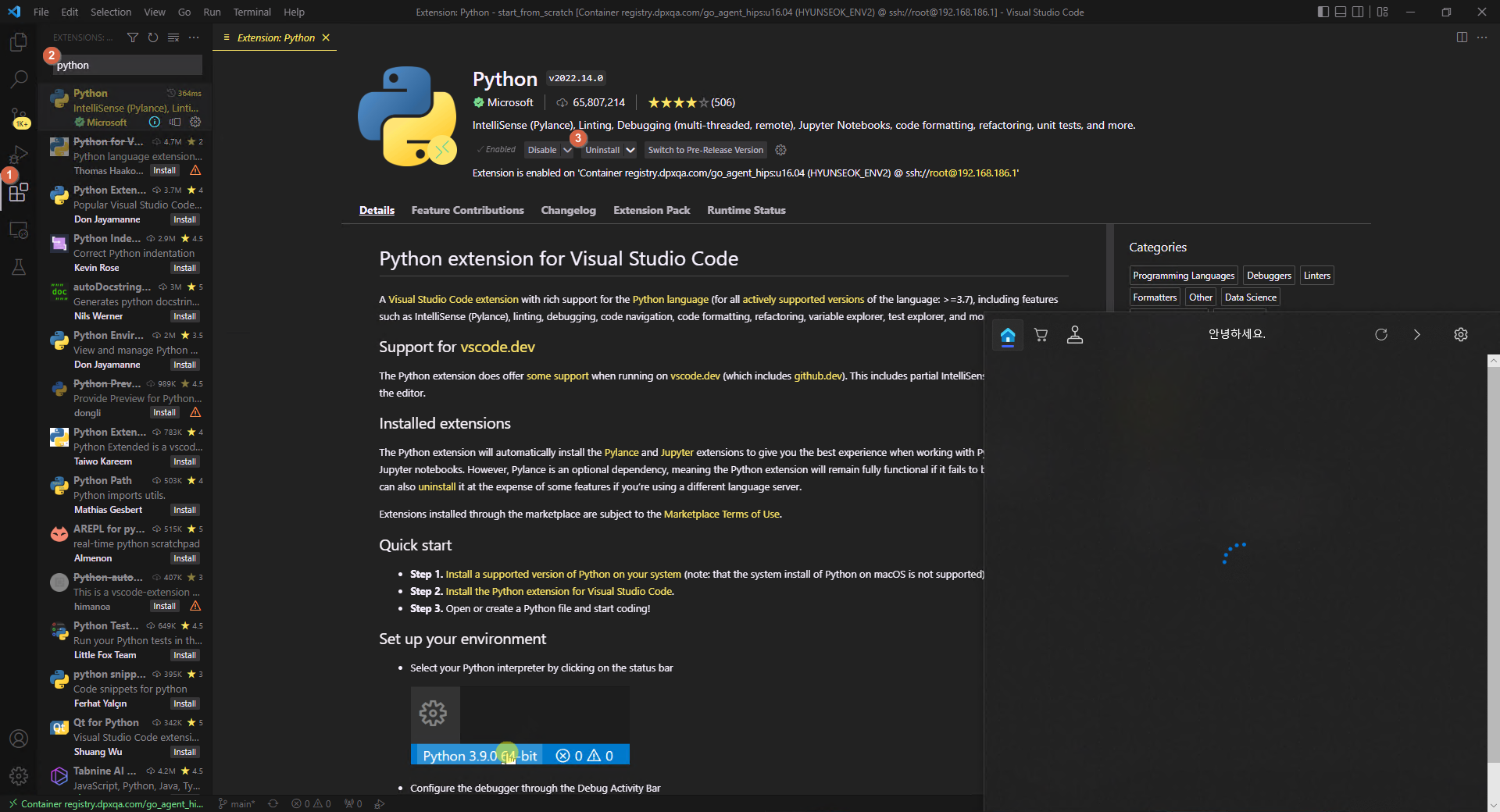 개발 환경을 Docker로 사용하는 경우, Docker와 VSCode를 연결하여 보다 편리한 환경을 제공하기 위함을 목적으로 합니다. 👉 VSCode 설정 아래 첨부 사진과 동일한 경로로 이동합니다. remote development를 검색 및 설치합니다. 👉 Docker 접속 설치가 완료되면 Docker 가 구동 중인 서버에 VSCode에서 ssh로 접속합니다. Ctrl + Shift + p 입력하여 검색 창 호출 후 'remote-containers'를 입력합니다. 노출되는 항목 중 'Attach to Running Container ..' 을 선택합니다. Running 상태인 Container가 있다면 아래와 같이 리스트가 생성됩니다. 만약 Running 중인 Container가 없다면 에러 메시지..